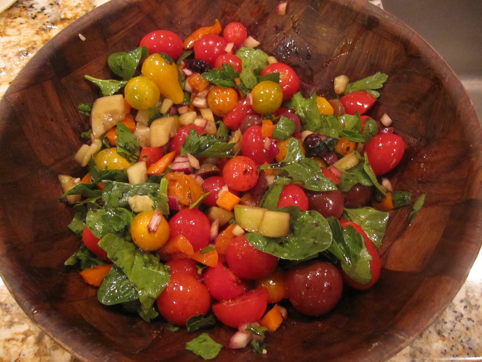 This is the yummy salad my mom made, with spinach, tomatoes, olives, and green peppers. We were going to put feta cheese in there, but we forgot.